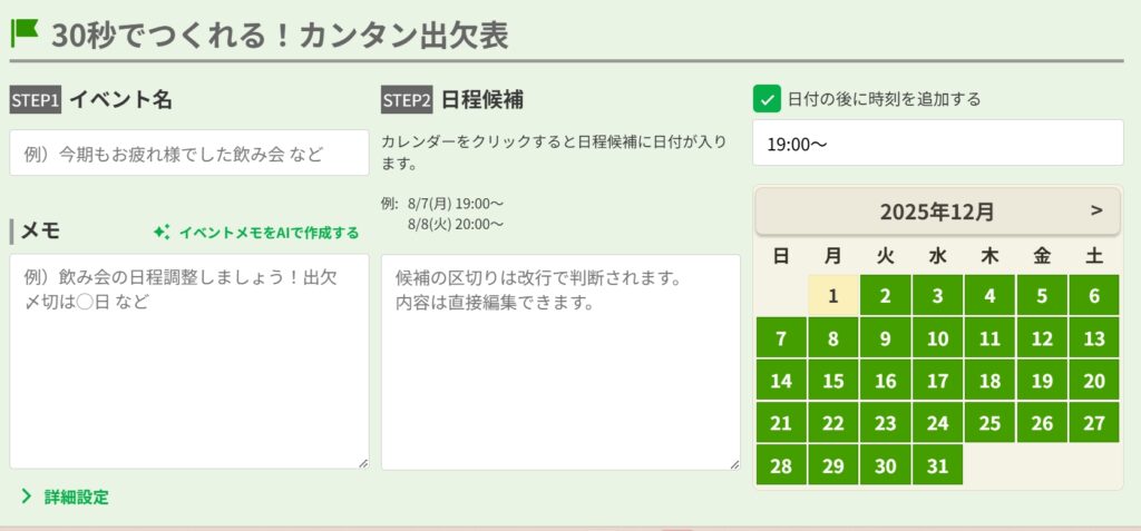 アカウント登録が一切不要で、誰でもすぐに使える国内定番のグループ日程調整ツールです。