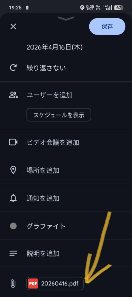 予定の作成画面で、先ほどGoogleドライブに保存した書類データ(PDF)をカレンダーの予定に添付するだけ!